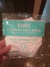 Arrived in new condition. Masks are marked KN95. Easy to wear when extra protection is needed. Took five weeks to US, but that’s expected. Thank you!