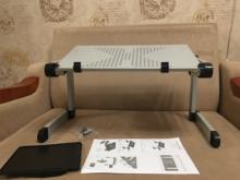 Ordered from a warehouse from Moscow. In the nearest suburbs brought Courier sdek for 11 days. The table itself is aluminum with knots of black plastic. Packed in a normal cardboard box, came all crumpled, but nothing damaged. Included instruction with pictures. She gathered a table herself without problems. The stand for the mouse did not even put, it is made of plastic, it is more convenient for me without it. The design is light but flimsy and shaky. The weight of the laptop can withstand. I bought my son. The whole design is held on plastic knots-that's about strength. As a temporary option will come down, but for constant use it is better to take something stronger, more reliable. Thanks to the store.