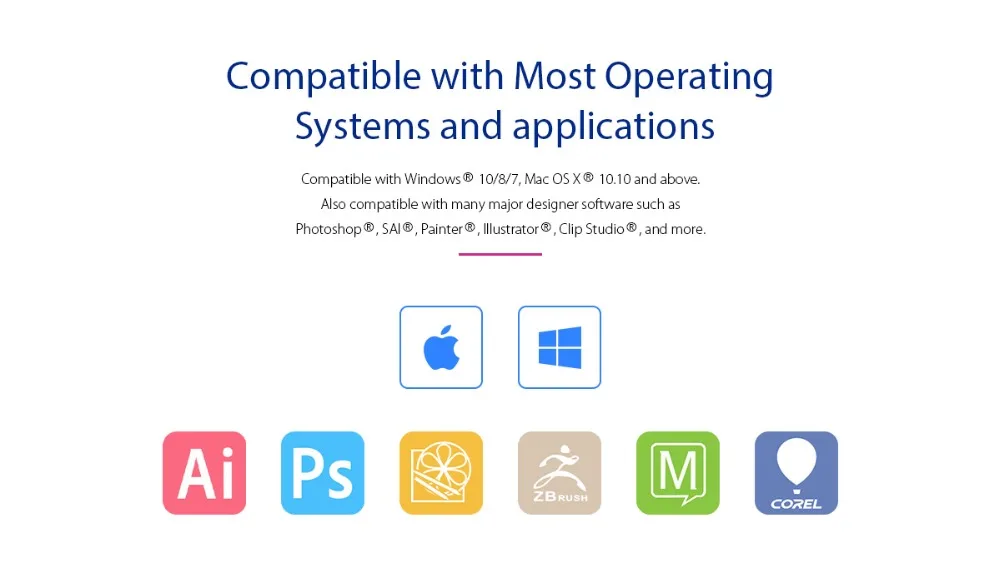 9. Compatible with Windows® 10/8/7, Mac OS X® 10.10 or later, and major graphics software such as Photoshop®, Painter®, Illustrator®, Clip Studio®, and more.