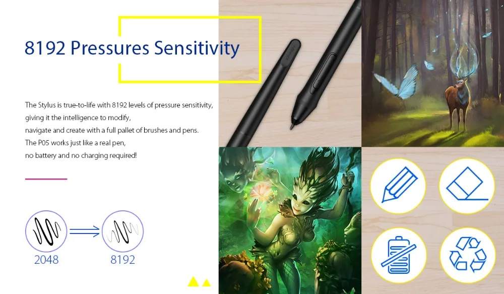 4. The latest Passive Pen design! Our P05 stylus technology provides 8192 levels of instant pen pressure sensitivity―Providing you with groundbreaking control and fluidity to expand your creative output. No charging required!
